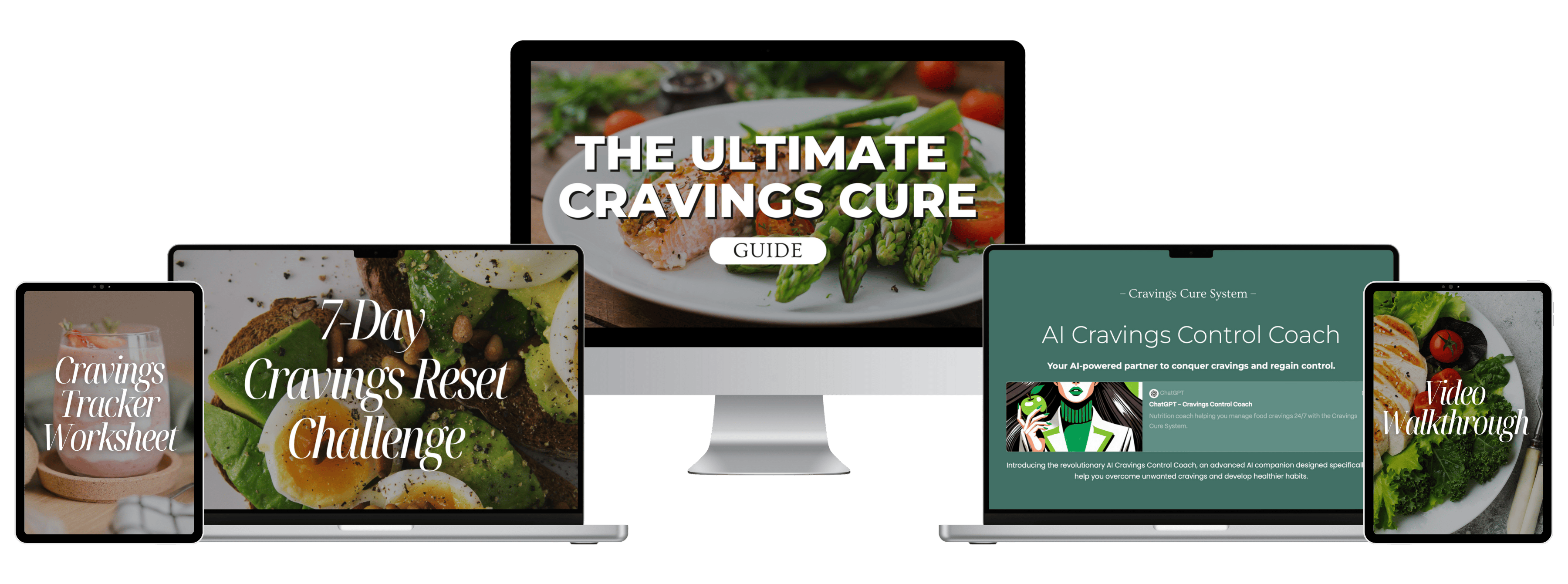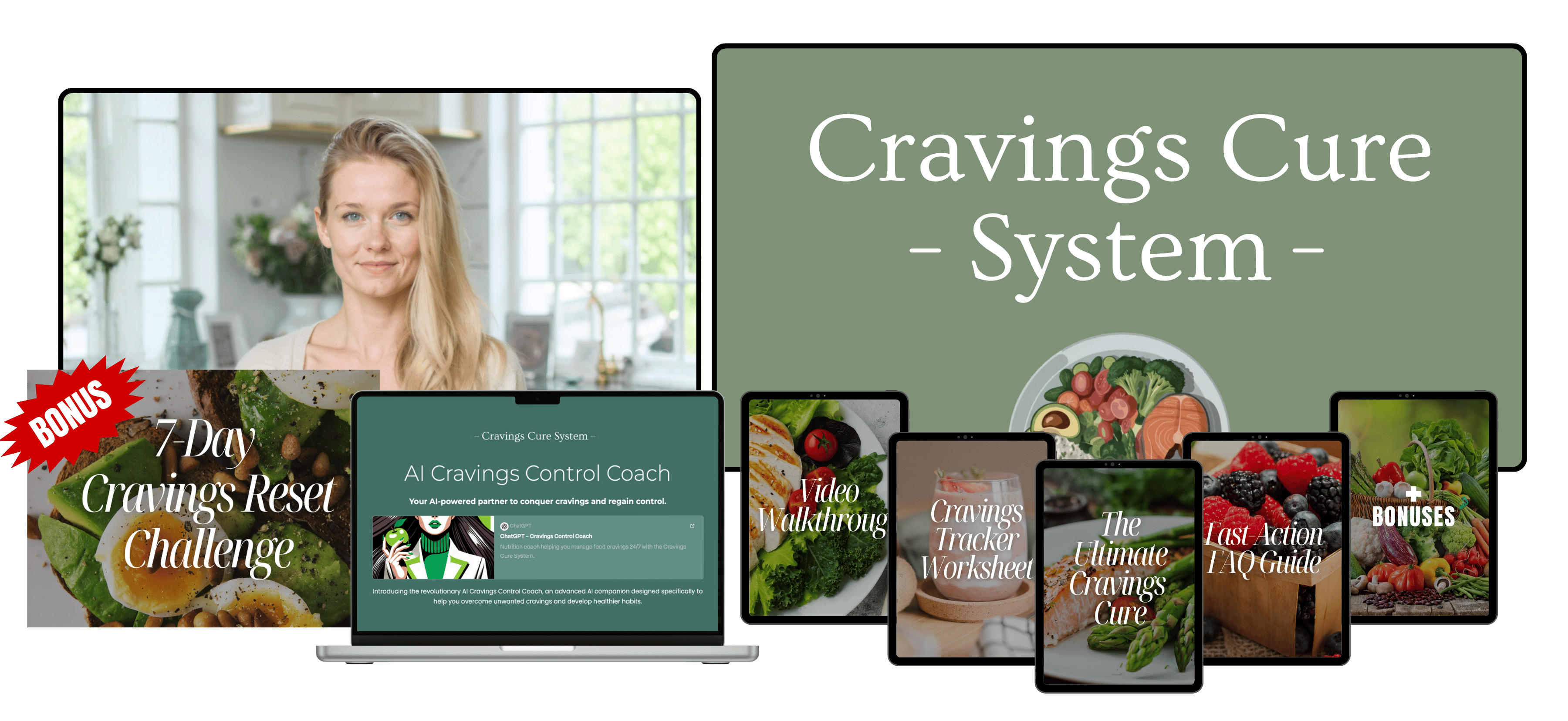 You’ll get The Ultimate Cravings Cure Guide (PDF), the Cravings Tracker Worksheet, Fast‑Action FAQ Guide, PLUS all the bonuses including the 7‑Day Cravings Reset Challenge, the AI Cravings Control Coach, and the Step‑by‑Step Video Walkthrough.